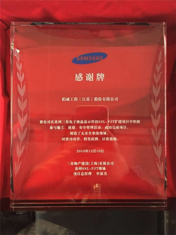 近日,我司在蘇州三星項(xiàng)目施工中積極參與施工、質(zhì)量、安全管理活動,成功完成項(xiàng)目,創(chuàng)造了無安全事故現(xiàn)場,三星物產(chǎn)建設(shè)(上海)有限公司特頒發(fā)“感謝牌”以示表彰。