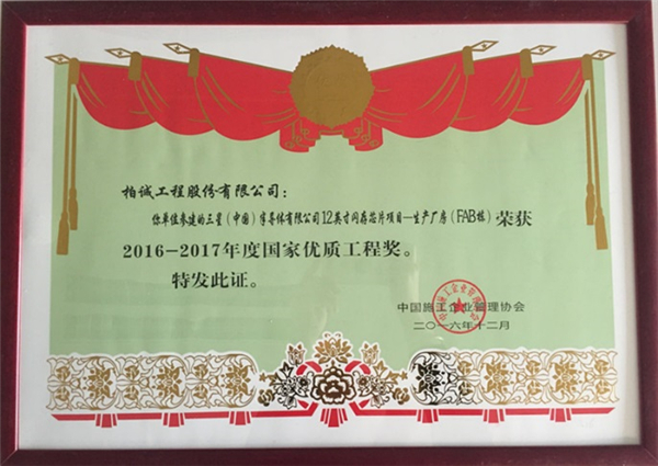 2016年12月,我司參建的三星(中國)半導(dǎo)體有限公司12英寸閃存芯片項目-生產(chǎn)廠房(FAB棟)榮獲“2016-2017年度國家優(yōu)質(zhì)工程獎”。