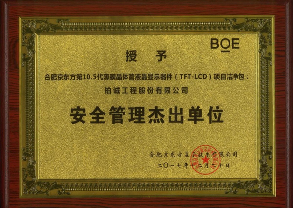 2017年12月,我司在合肥京東方第10.5代薄膜晶體管液晶顯示器件( TFT-LCD )潔凈包項目中喜獲”安全管理杰出單位”和”杰出承包商”稱號。