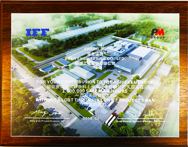 2018年6月,我司在國(guó)際香料(張家港)天鵝項(xiàng)目中喜獲“一百萬(wàn)無(wú)損安全工時(shí)獎(jiǎng)”。