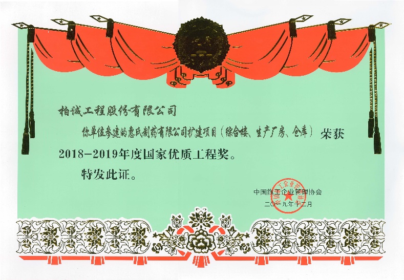 近日,我司參建的“惠氏制藥有限公司擴(kuò)建項目(蘇州輝瑞鉆石項目)”榮獲2018-2019年度“國家優(yōu)質(zhì)工程獎”。