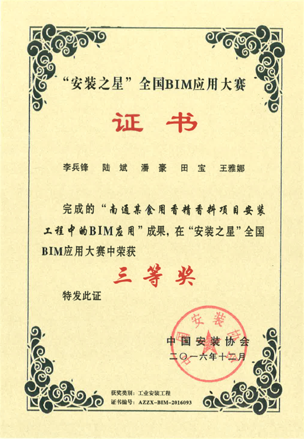 近期,在中國安裝協(xié)會主辦的“安裝之星”全國BIM應(yīng)用大賽中,公司參賽作品“南通某食用香精香料項目安裝工程中的BIM應(yīng)用”喜獲三等獎,特此通報。