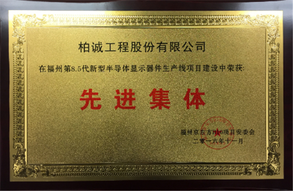 2016年11月,我司在福州京東方第8.5代線新型半導(dǎo)體顯示器件生產(chǎn)線項目中榮獲“先進集體”獎。