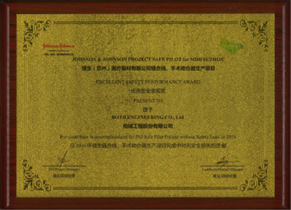 近期,我司項目團隊在強生(蘇州)醫(yī)療器材有限公司縫合線、手術吻合器生產項目中,對無安全損失做出了貢獻,被業(yè)主授予”優(yōu)秀安全表現(xiàn)獎”。